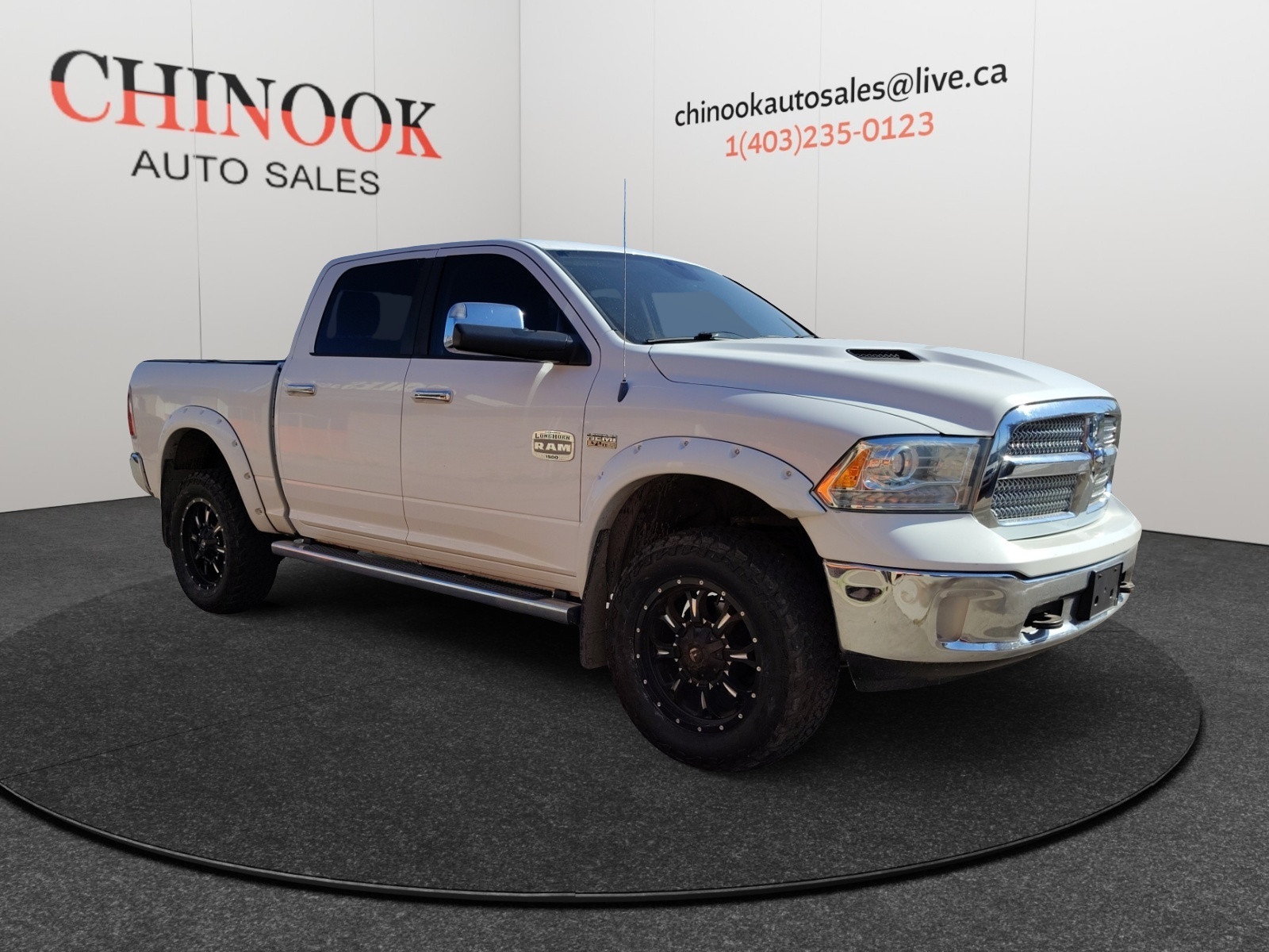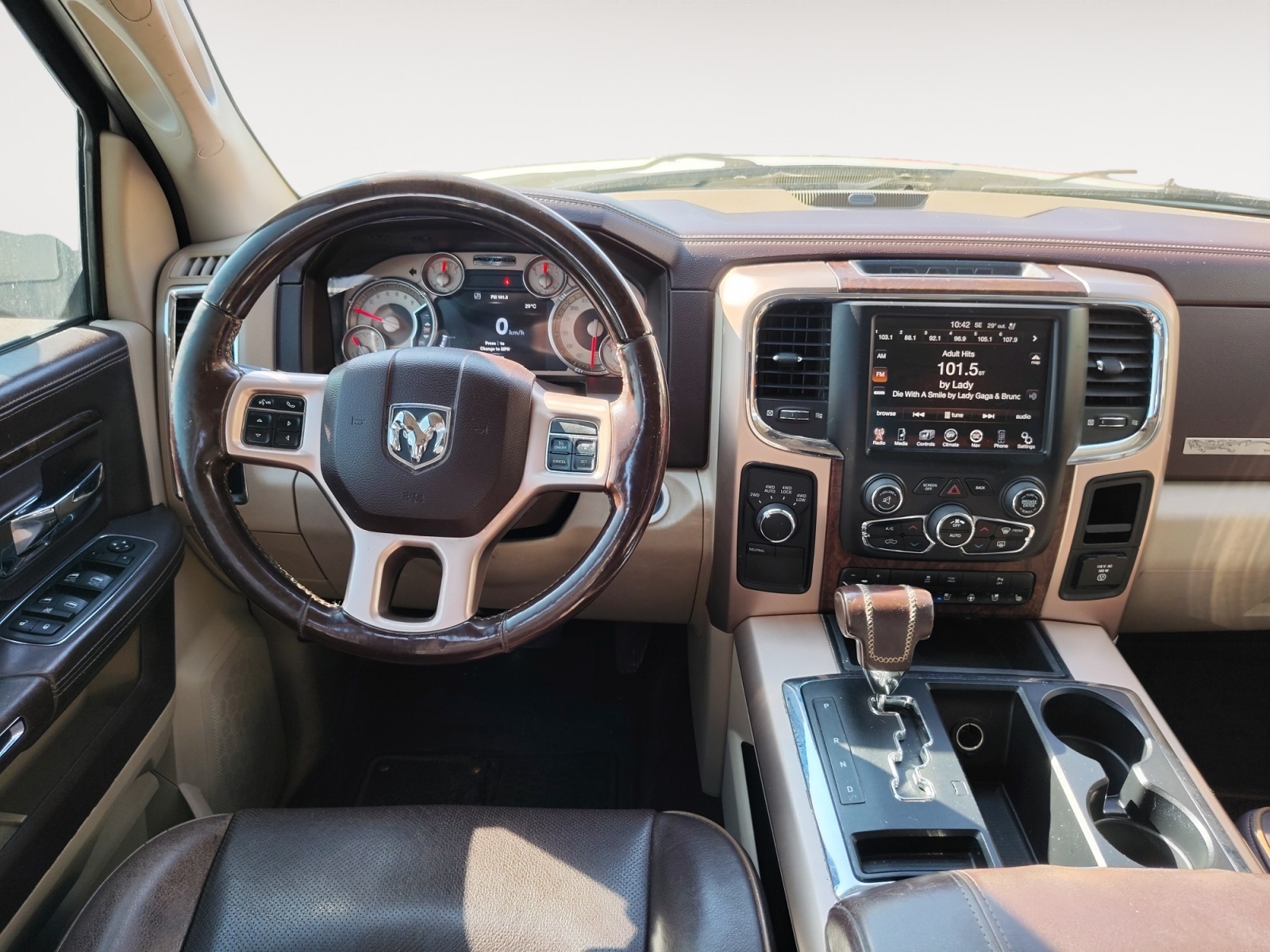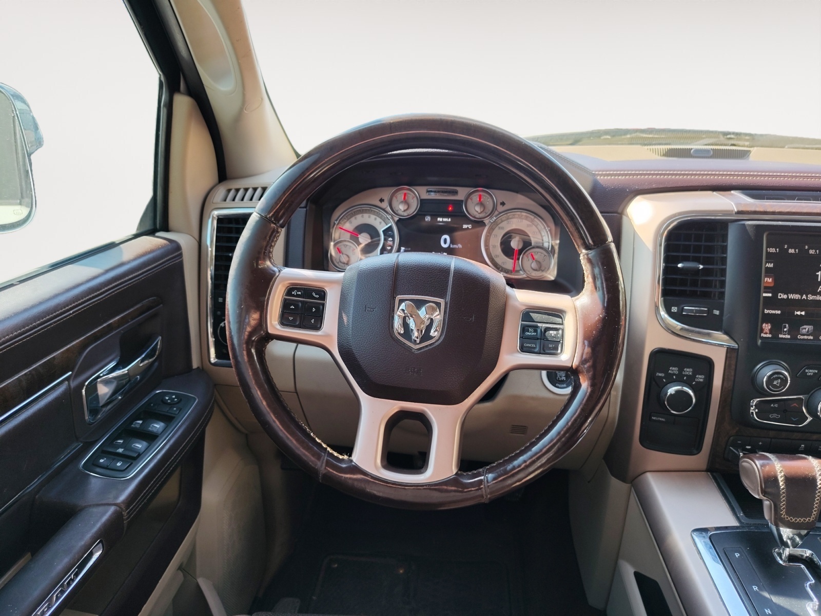 This used 2013 Ram 1500 Laramie with the 5.7L Hemi V8 engine is a luxurious, powerful, and modern full-size pickup truck known for its comfortable cabin and strong performance, offering 395 horsepower, paired with an 8-speed automatic transmission and a rotary shifter. Key features include a chrome grille, 20-inch wheels, leather-faced seats, heated steering wheel, a 7-inch vehicle information center, and dual-zone automatic temperature control.