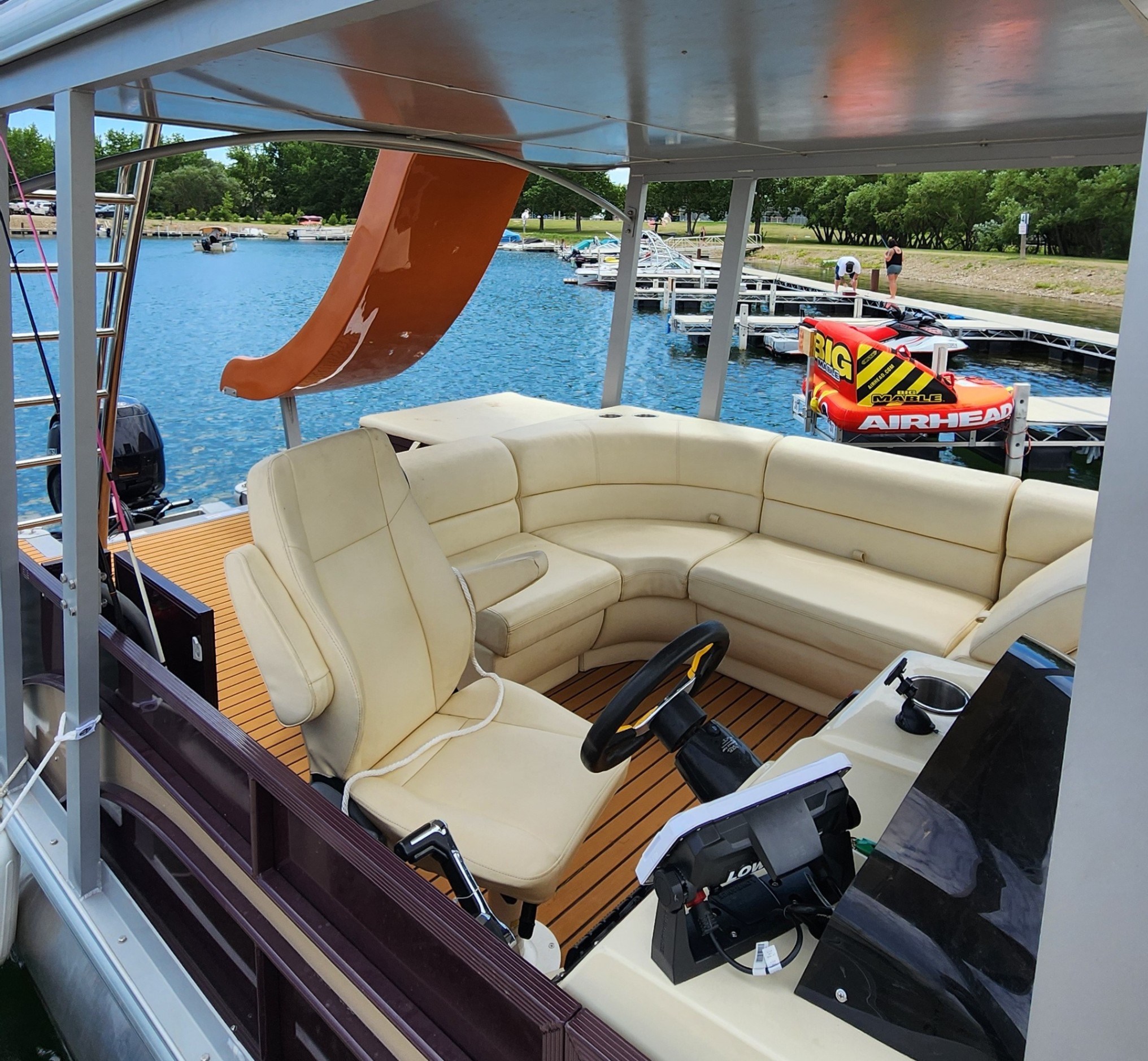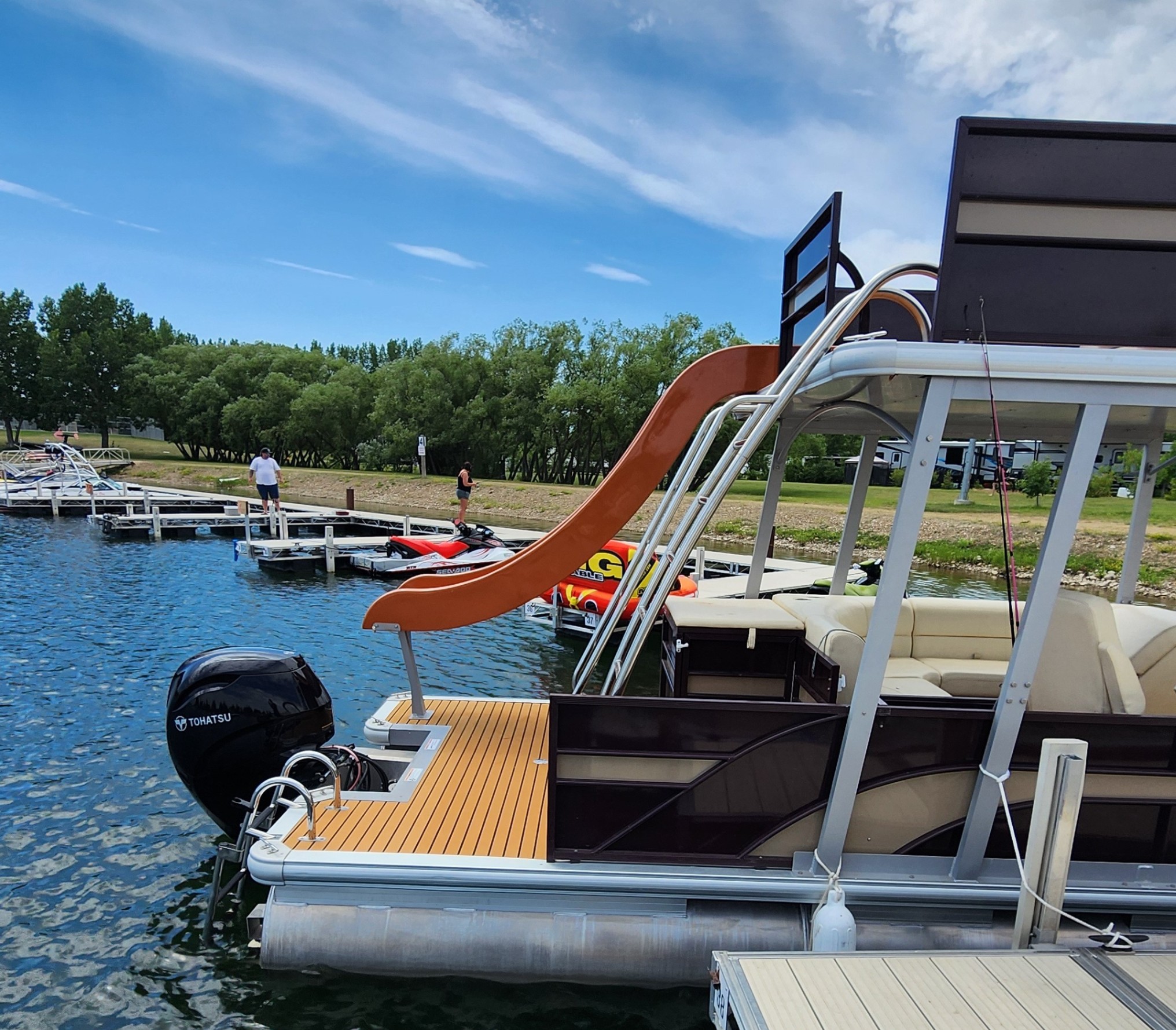 This pontoon boat is equipped with a 140-horsepower Tohatsu Japanese outboard engine with a 90-liter fuel tank and brand new 2022 U-Built double axle trailer with electric brakes. The engine comes with a 5-year manufacturer warranty valid until January 2028. Lots of space on board for passengers with 12 people maximum capacity rating. The boat features plenty of storage space under each sofa. The upstairs deck also has the sofas for tanning, seating, with access to water slide. The section under the slide opens up to a changing room and a portable toilet. This pontoon comes with Lowrance Elite fish finder which gives extra information on the speed of the boat, depth of the lake, and many more. The onboard sound system features Bluetooth, USB, and AUX wire connectivity. Onboard battery comes with a dockside charging port when stationary or not in use. This pontoon boat is great for family adventures. Kids especially will love it.